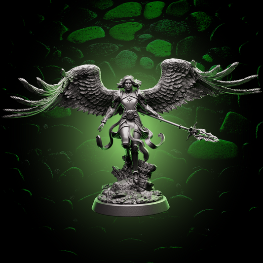 • Aasimar Paladin miniature with outstretched wings and ornate spear, featured for fantasy tabletop RPG characters. | Helios Tabletop