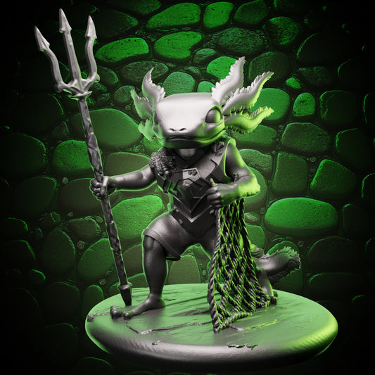 • Close-up of Axolotl Fighter miniature holding a trident and net, detailed fantasy RPG resin model for 5e and Pathfinder.