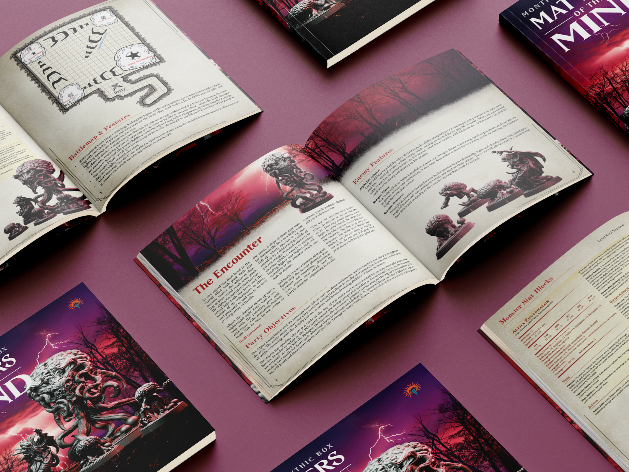 As a DM, you’re constantly juggling prep time, sourcing minis, and finding fresh ways to keep your players engaged. Our Mythic Boxes takes the stress out of prep by delivering a complete, ready-to-run 5e encounter straight to your doorstep. Each box includes high-quality 3D-printed enemy minis with DM handbook packed with 5e statblocks and combat mechanics, a battlemap and more all written by our team of DMs giving you everything you need to drop the encounter right into your ongoing campaign or run it as a one-shot.